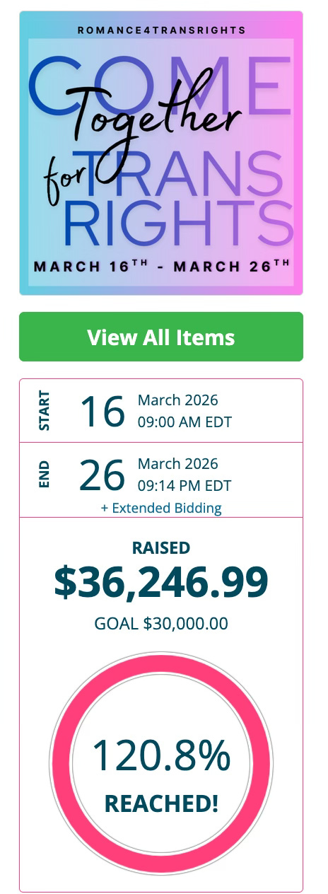 Which reminds me, the Romance4TransRights auction I was a part of raised over 36K!!! Thank you to everyone who bid in the auction. The folks who won paperbacks from me should be getting them any day in the mail.